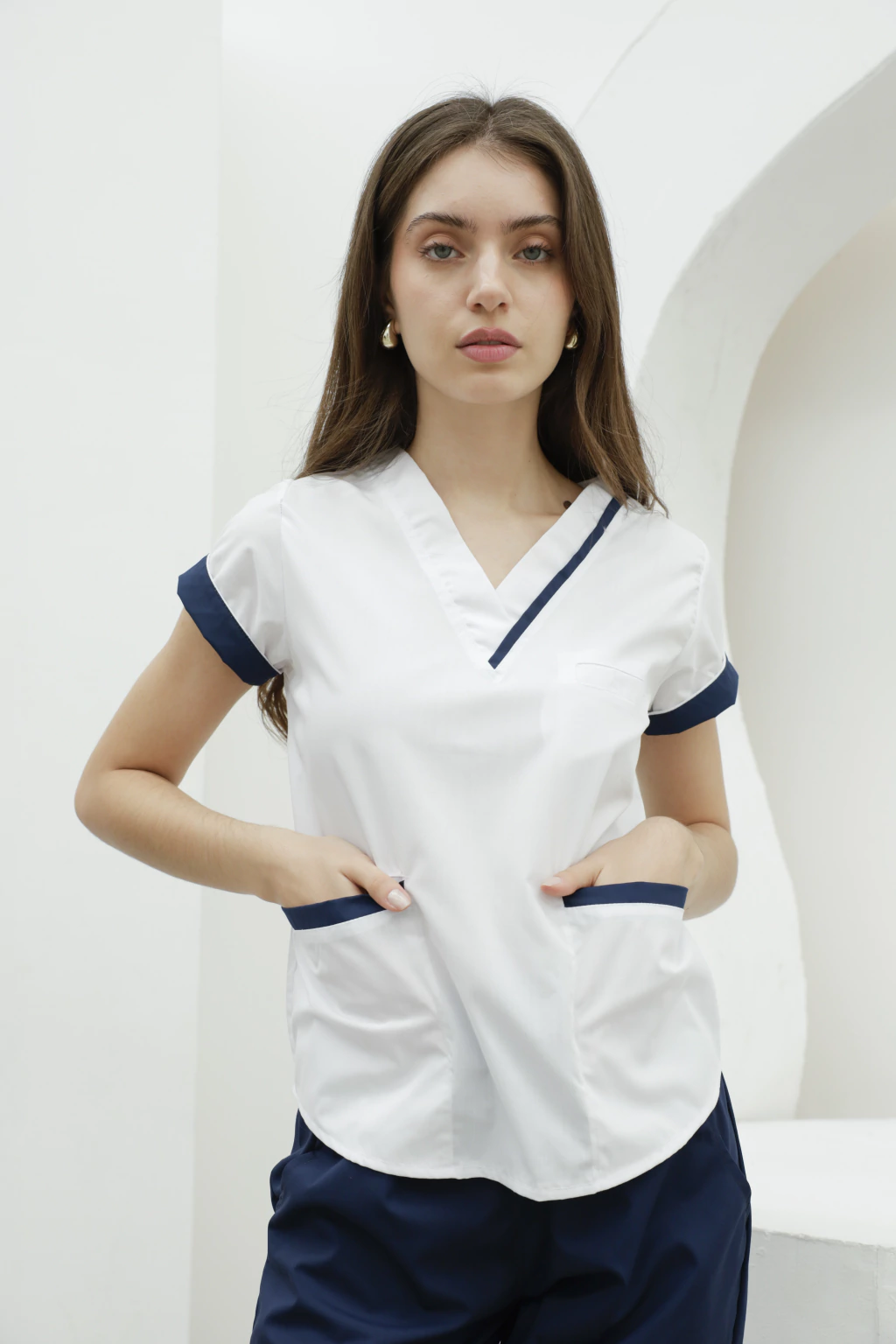 Cuello V, bolsillos frontales y tiras regulables. Pantalón recto