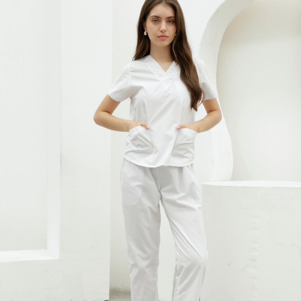 Cuello V, bolsillos frontales y tiras regulables. Pantalón arciel recto