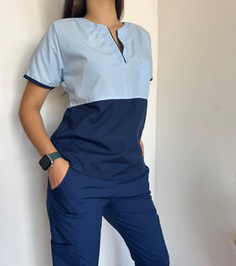 Ambo Pili bicolor celeste y azul. Pantalón cargo azul liso